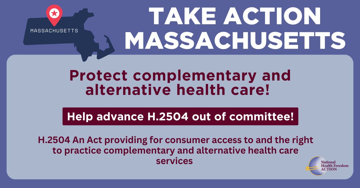Act Now and Support H.2504 to protect complementary and alternative health care. Ask the House Committee on Public Health to advance this important bill out of committee!Enter your information to send an email to the House Committee on Public Health and ask them to support H.2504 an Act Providing for Consumer Access to and the Right to Practice Complementary and Alternative Health Care Services.