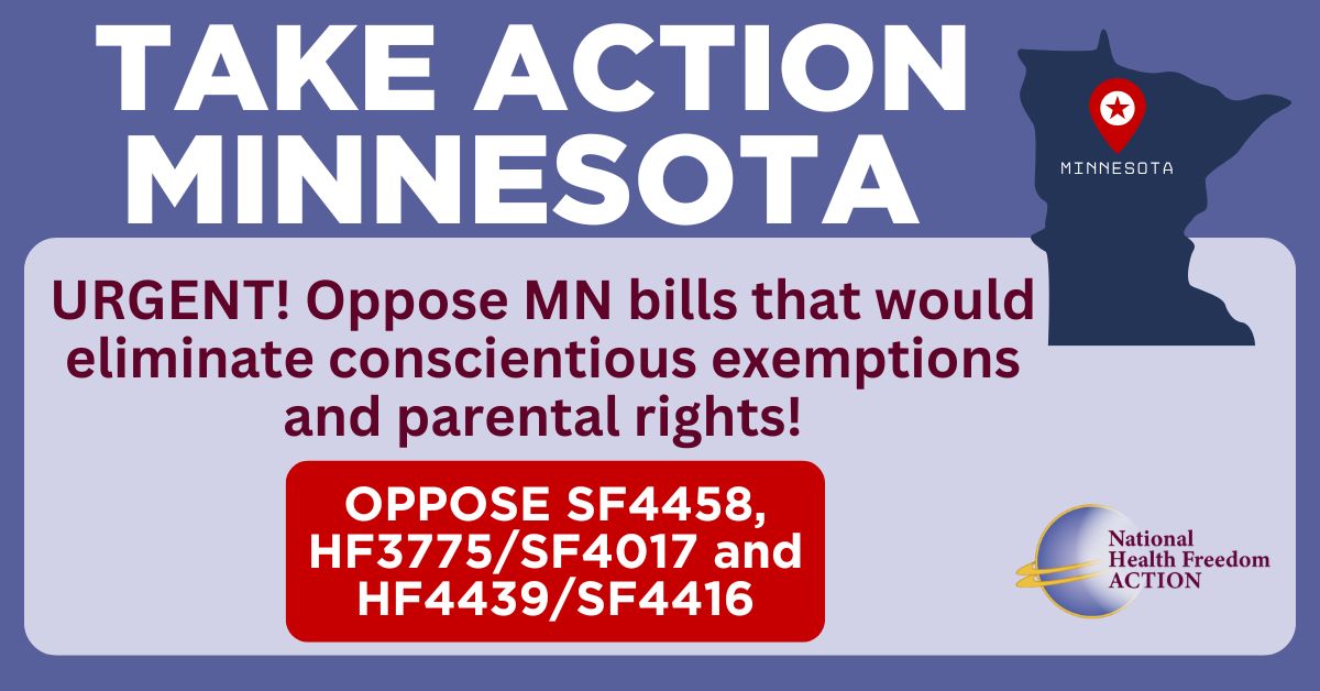 Act now to oppose Minnesota bills SF4458, HF3775/SF4017 and HF4439/SF4416 that would eliminate conscientious exemptions and their parental rights!